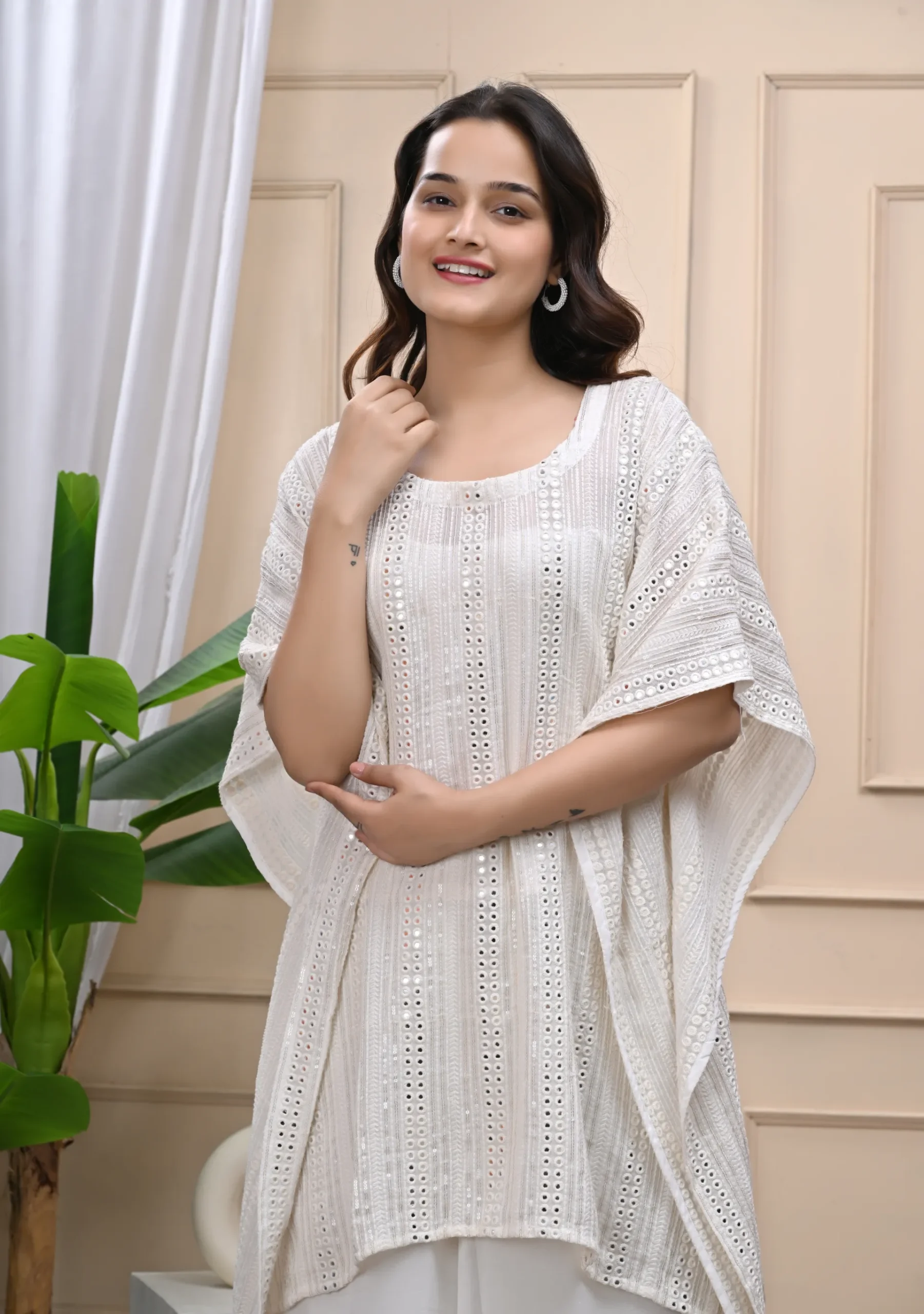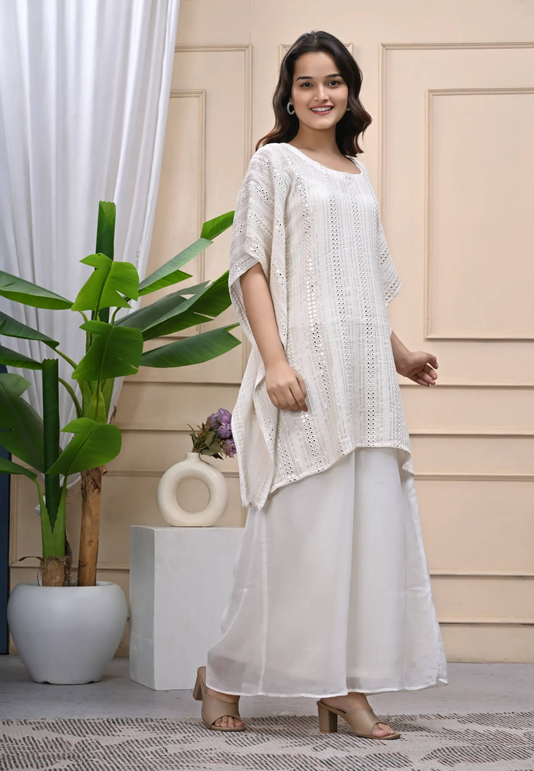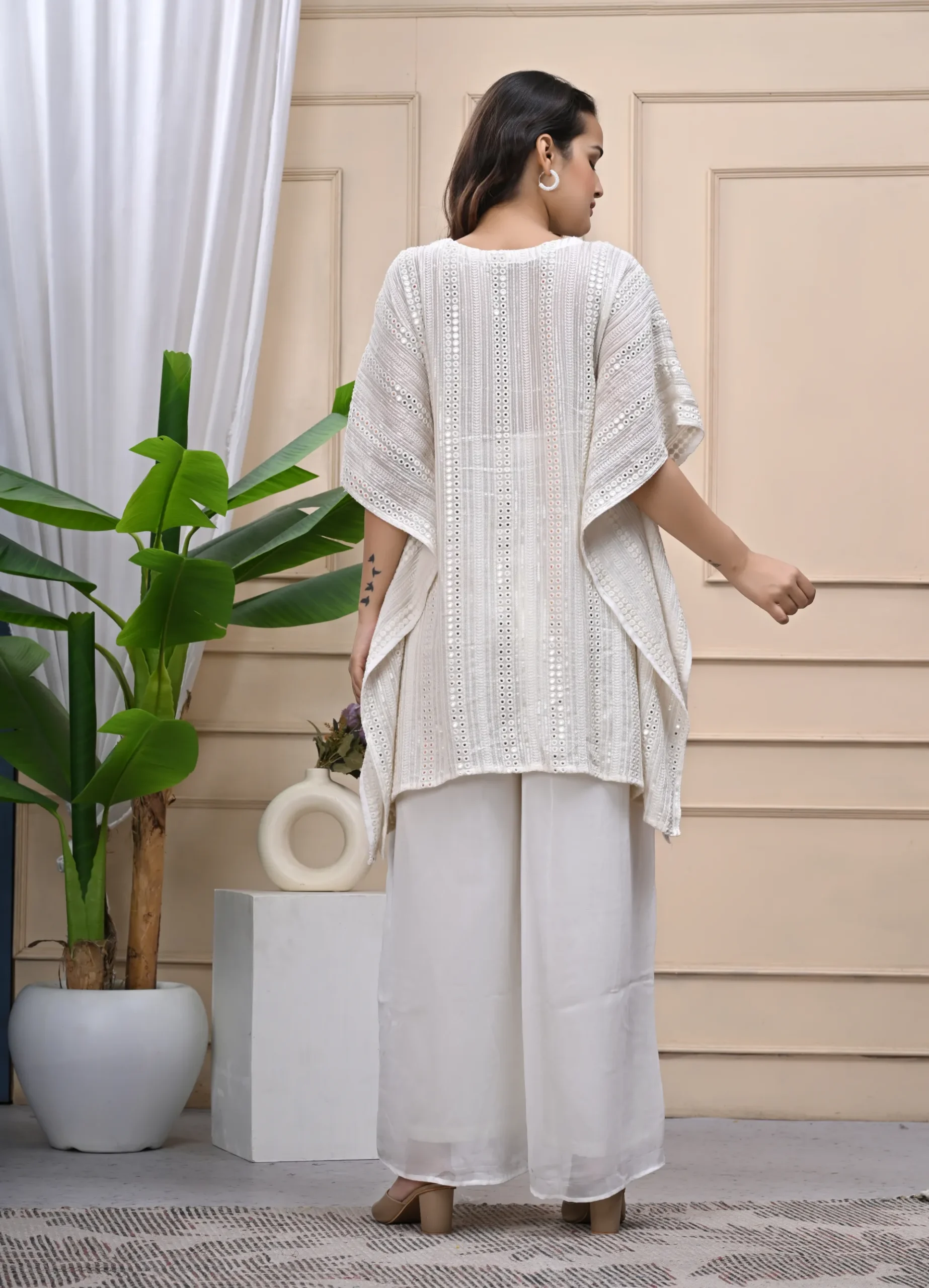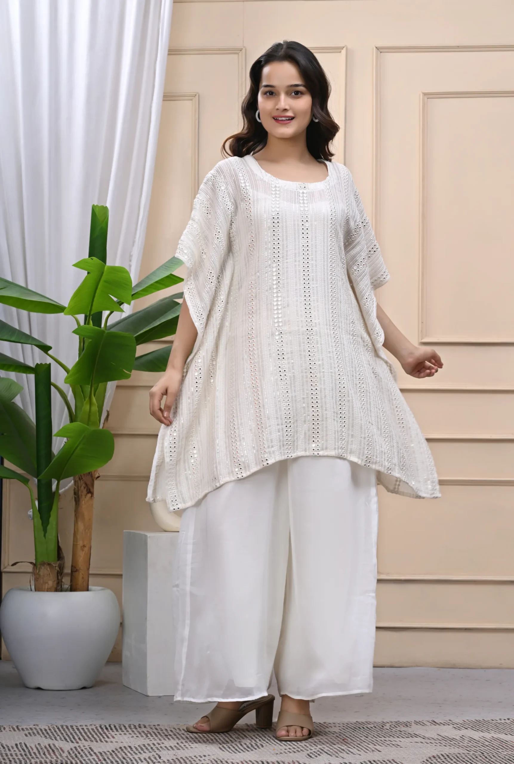 This Chikankari Palazzo Set is a soft and elegant outfit featuring an intricately embroidered chikankari georgette kaaftan and matching georgette palazzo pants. The breathable and lightweight fabric makes it perfect for festive daywear or a relaxed ethnic look. It’s a versatile piece that balances traditional embroidery with a modern silhouette.