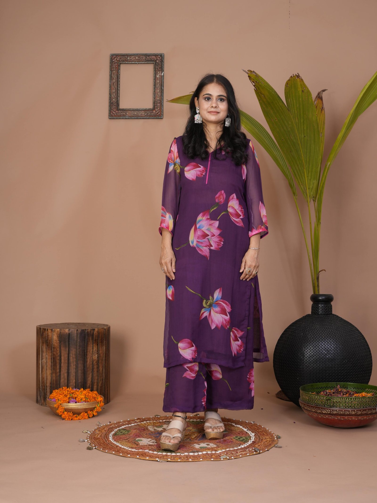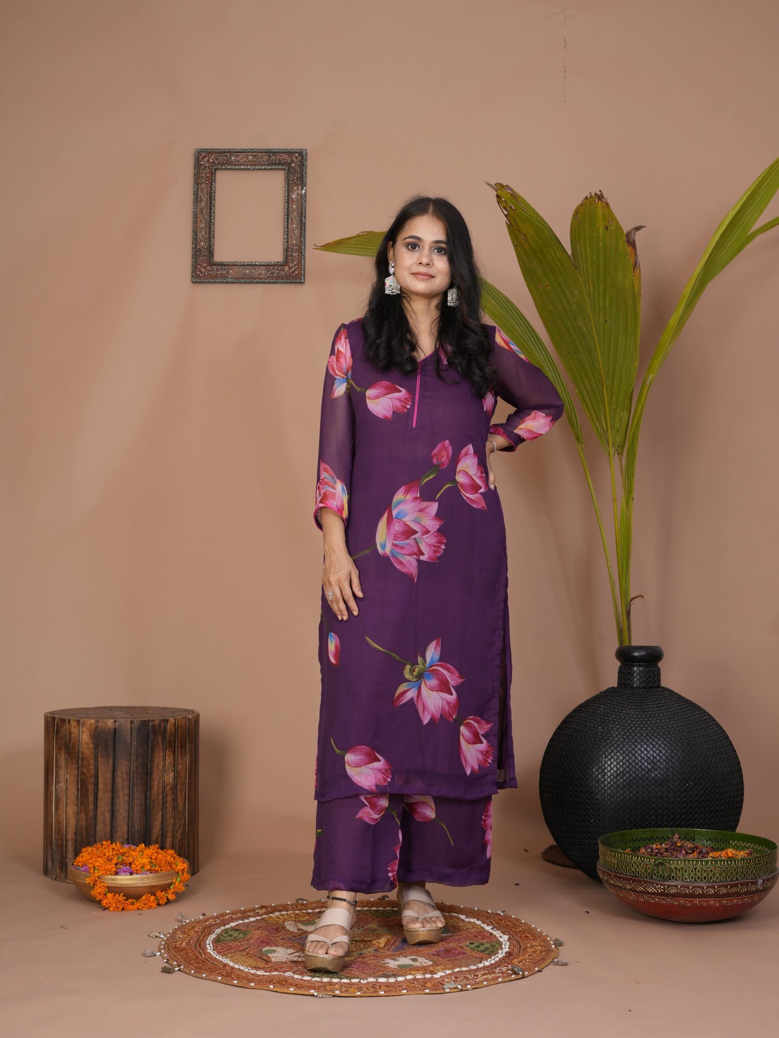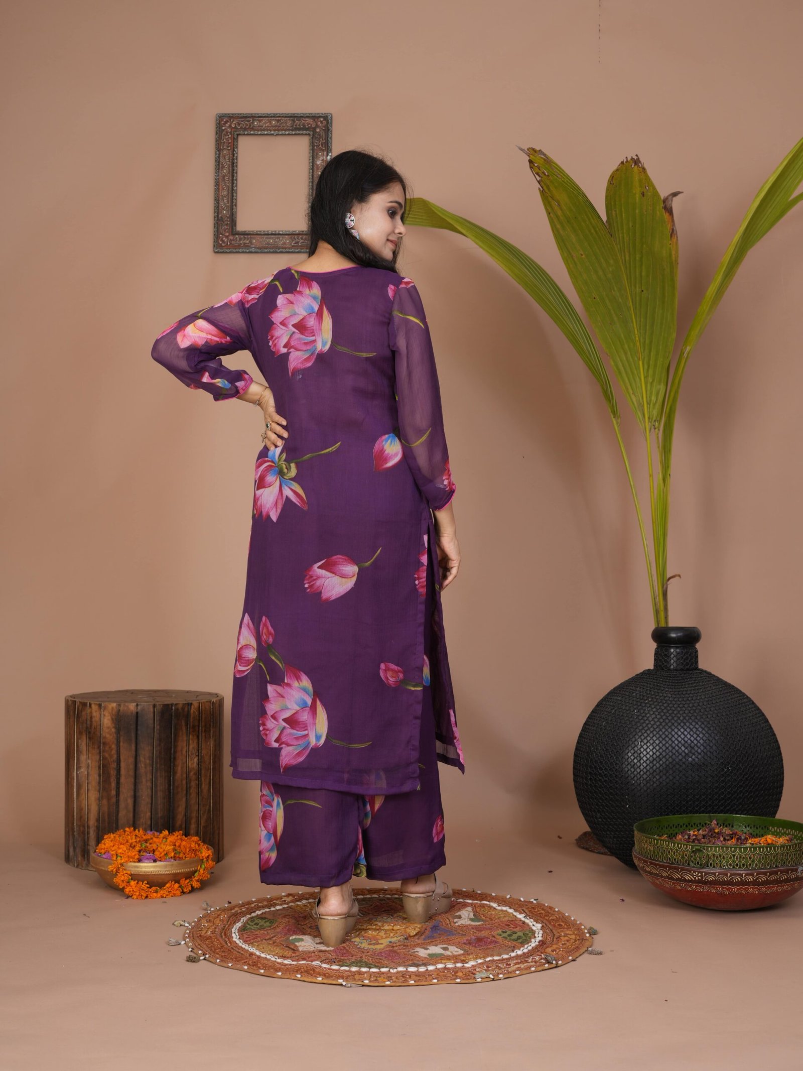 Step into understated charm with this Purple Suit Set designed from airy chiffon. The lightweight kurta and palazzo provide both comfort and movement, making it a beautiful choice for daytime events, casual ethnic outings, or minimal festive dressing.