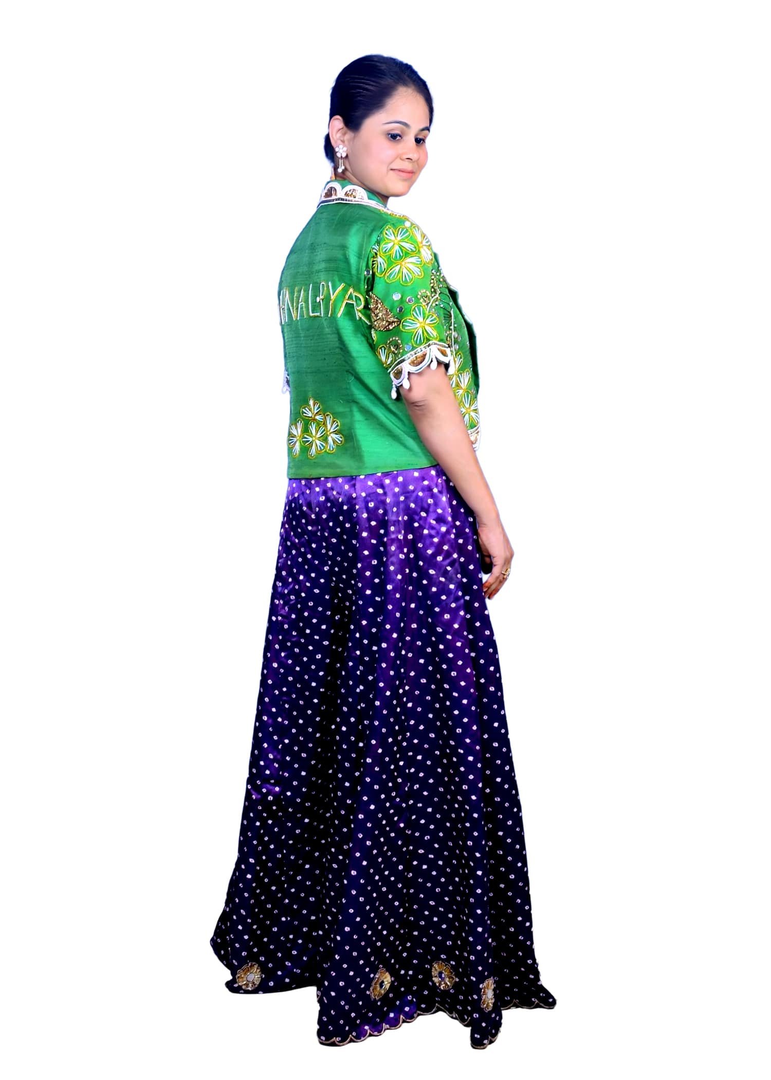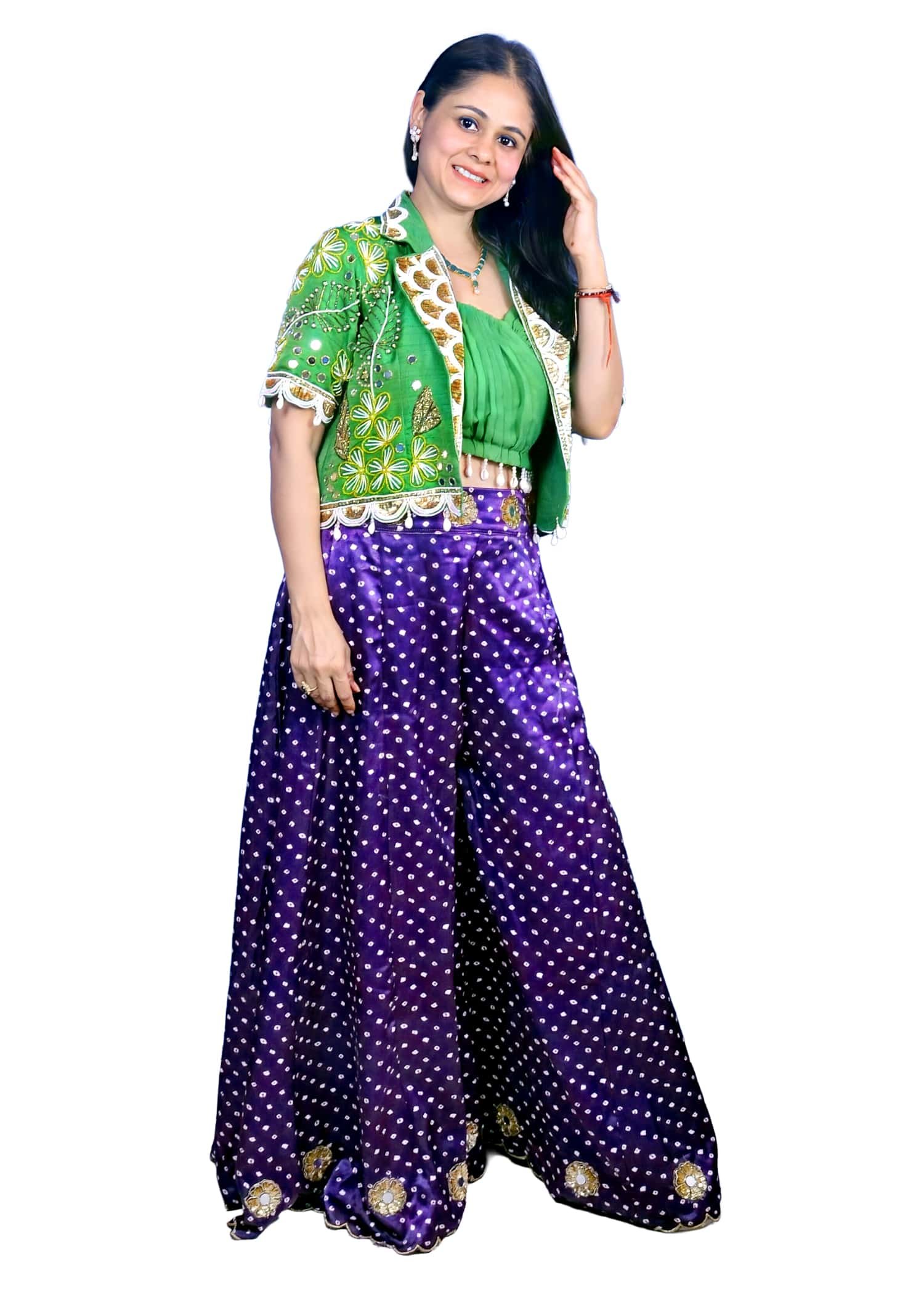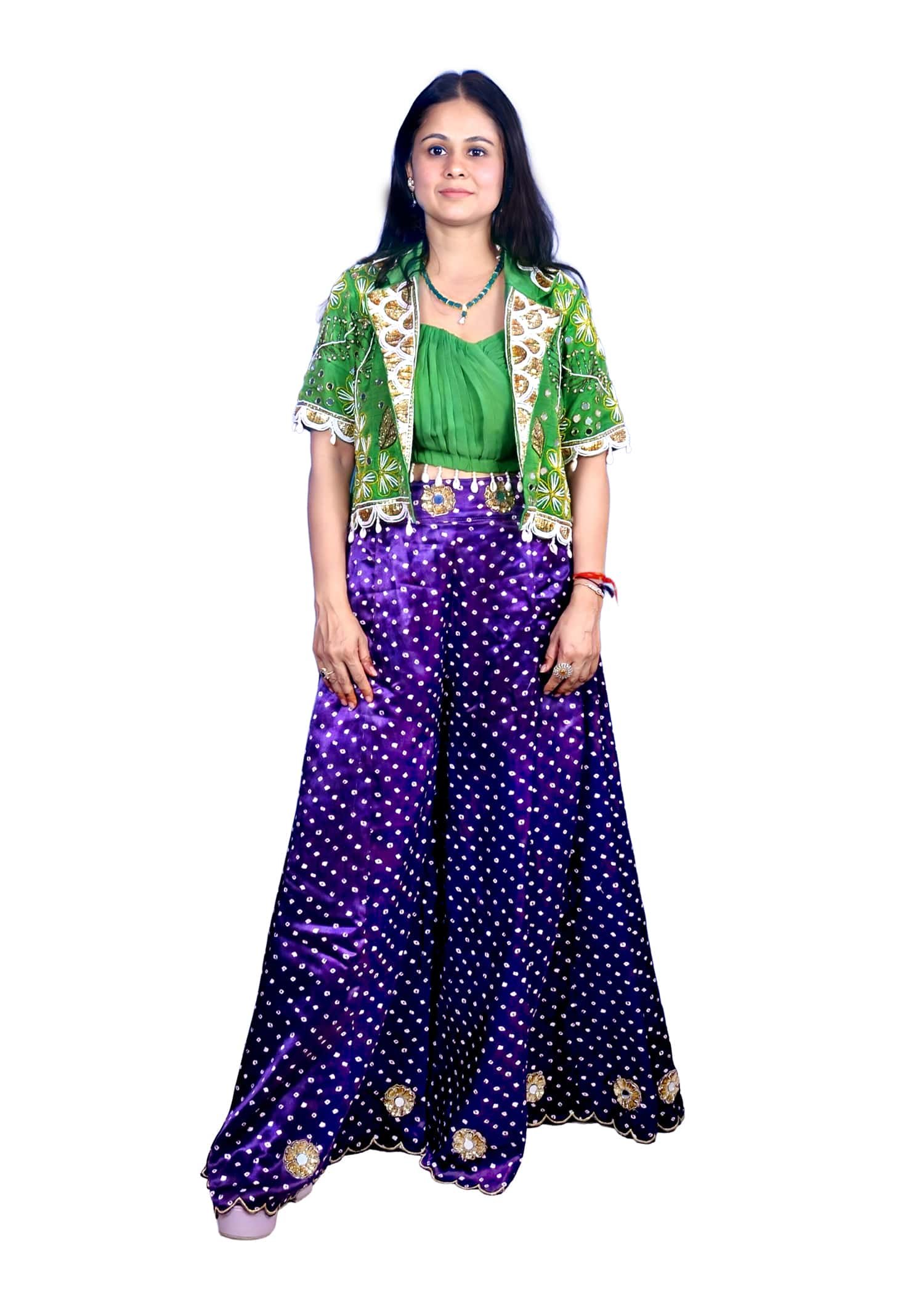 The Green Handwork Palazzo Set is designed to leave a lasting impression. The rich raw silk jacket showcases exquisite hand embroidery that reflects craftsmanship and tradition. It is complemented with flowy gazzi silk palazzo pants and a subtle georgette bustier, making it a bold yet elegant choice for festive or bridal occasions.