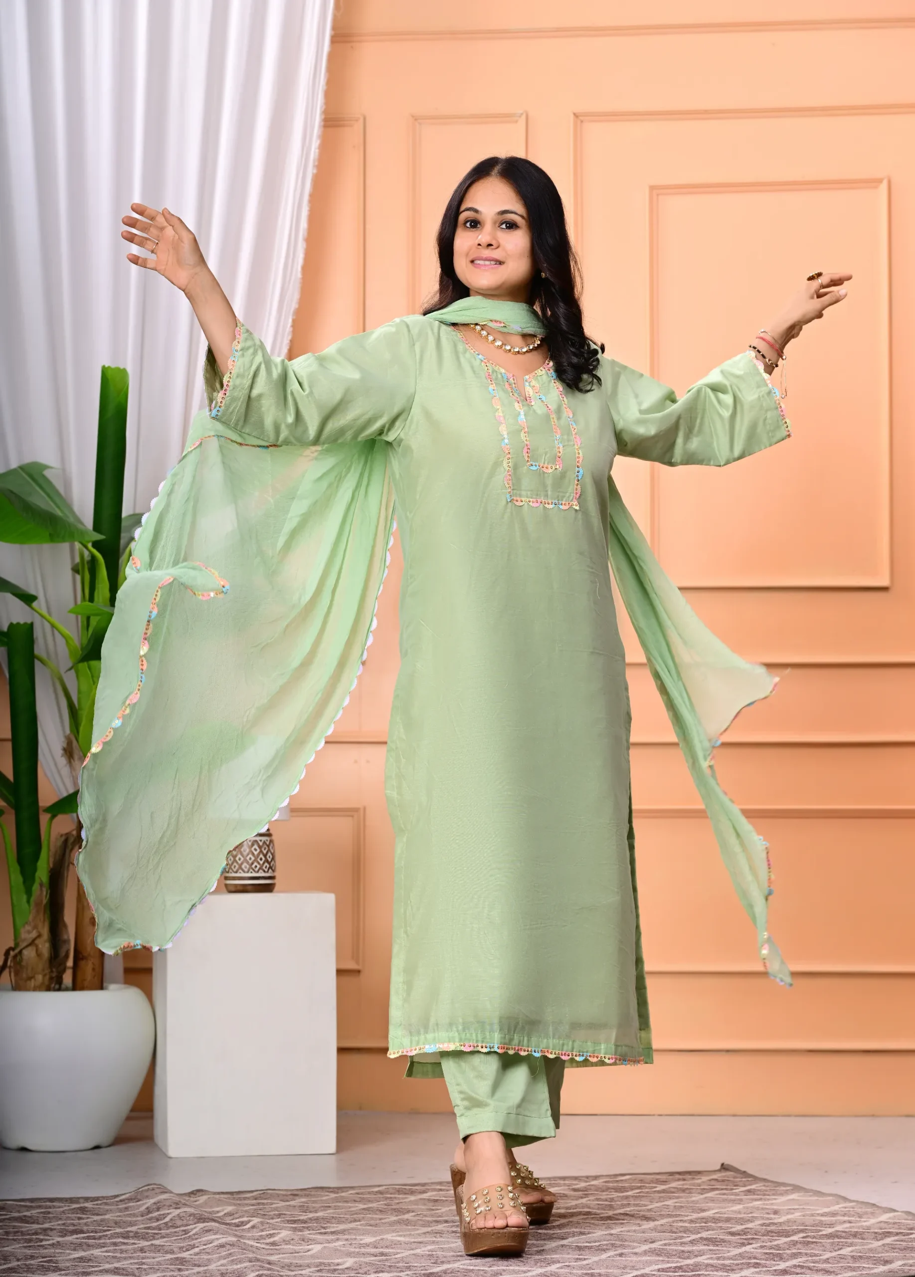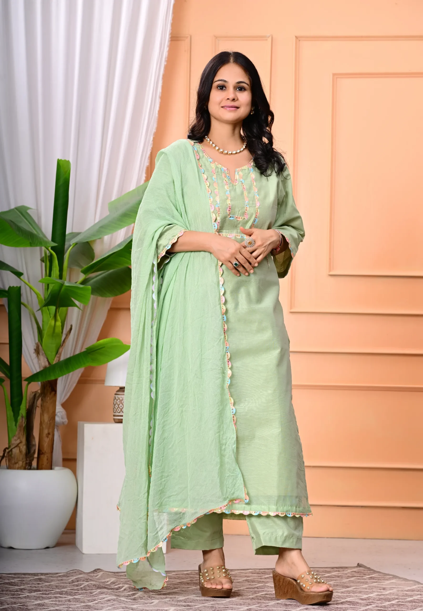 The Kohinoor Suit Set is a celebration of heritage craftsmanship and luxurious fabric. Crafted from premium chanderi, this set offers a delicate sheen and airy comfort, making it an ideal choice for both daytime elegance and evening charm. Whether styled for a festive celebration or a special outing, it’s designed to make you look effortlessly regal.