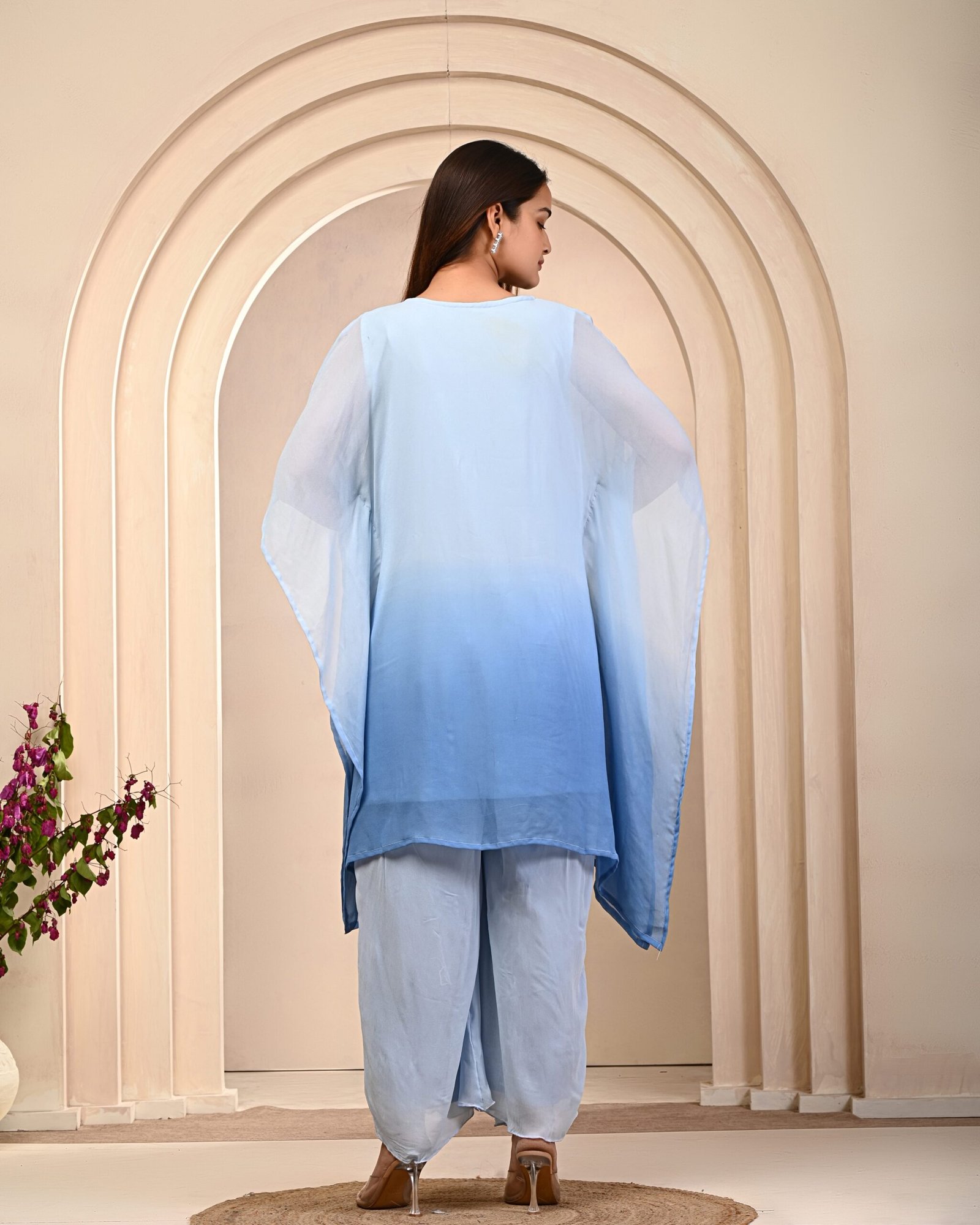 Ombre Powder Blue Kaftan Set in soft Georgette with matching Palazzo pants. Breezy, elegant, and perfect for festive or casual occasions. ₹3,999/-