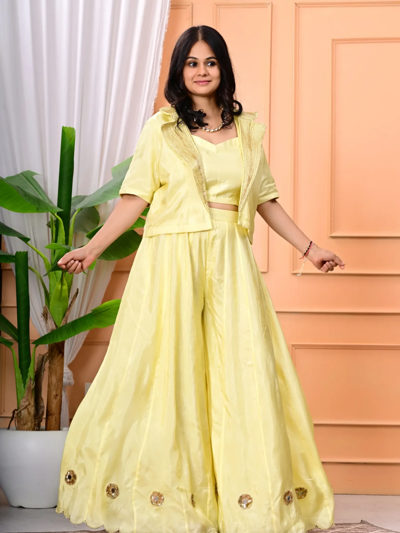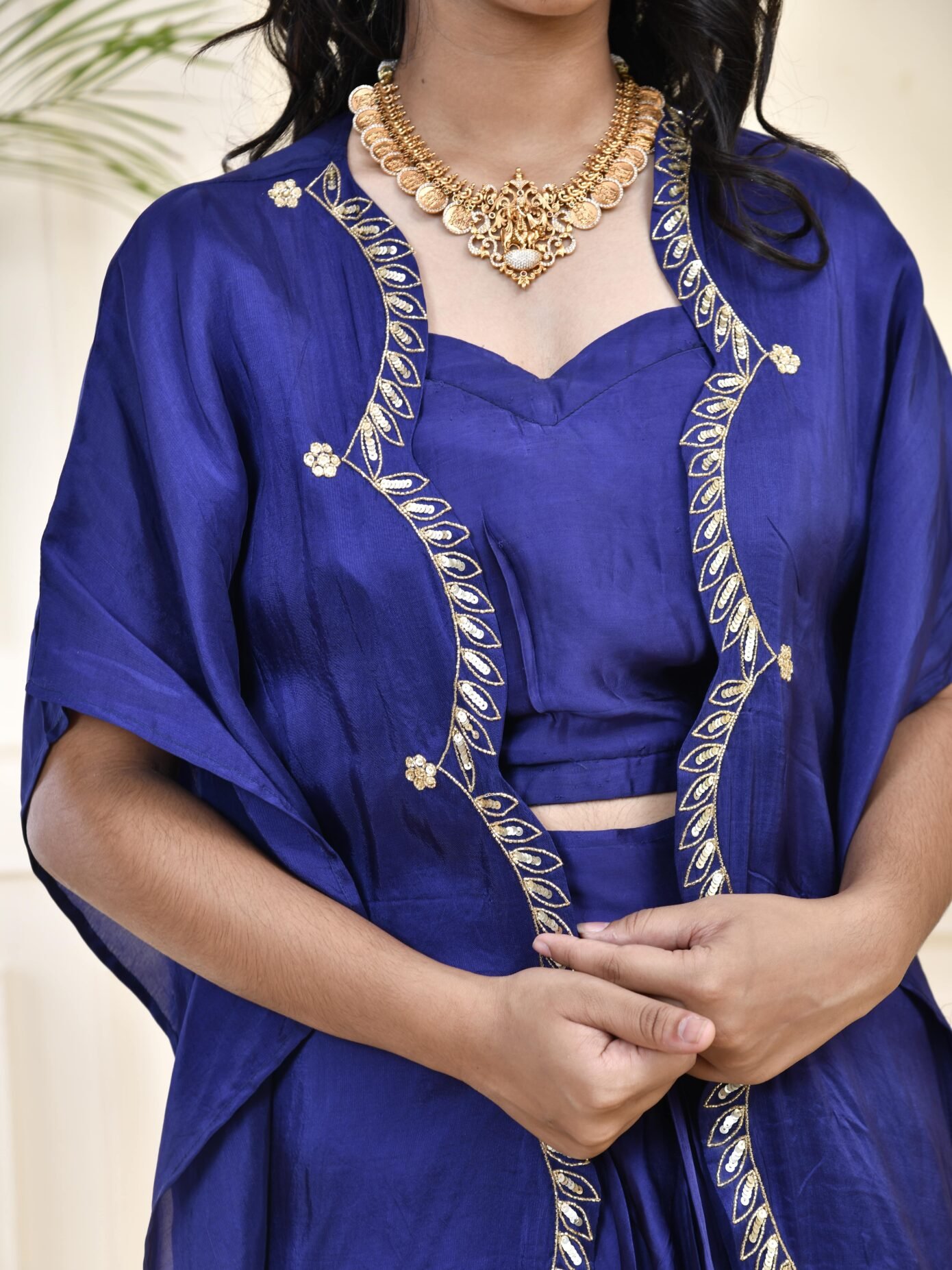 Style it with a sleek bun, statement earrings, and pastel heels for a classy festive look.