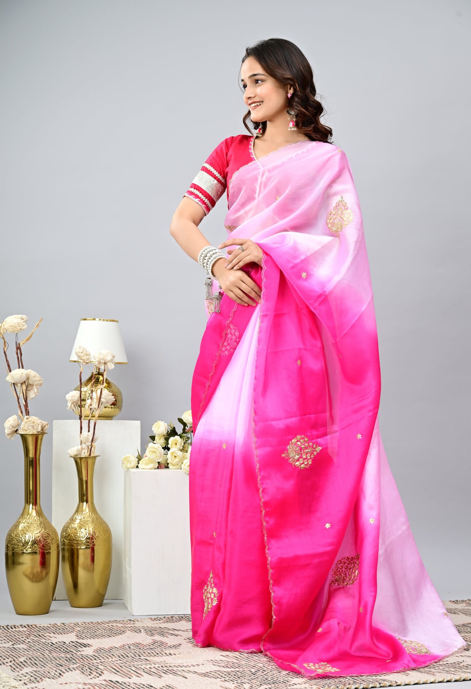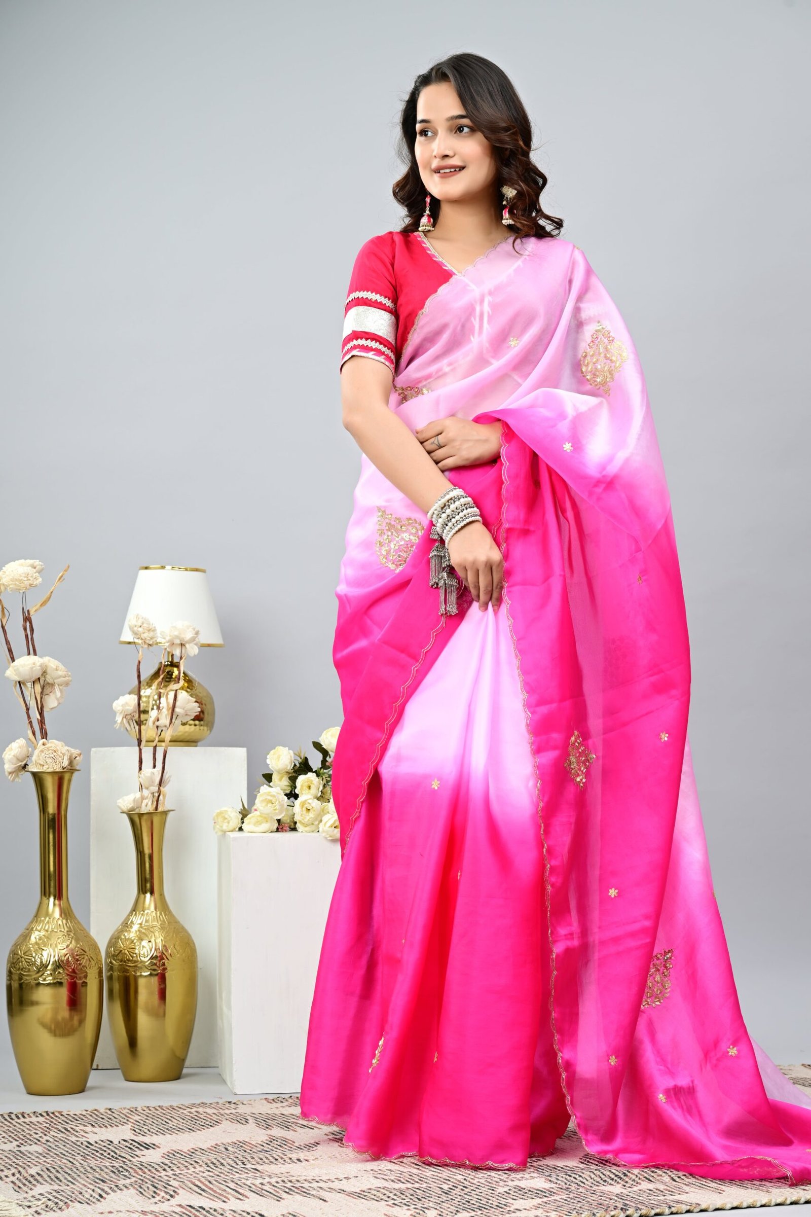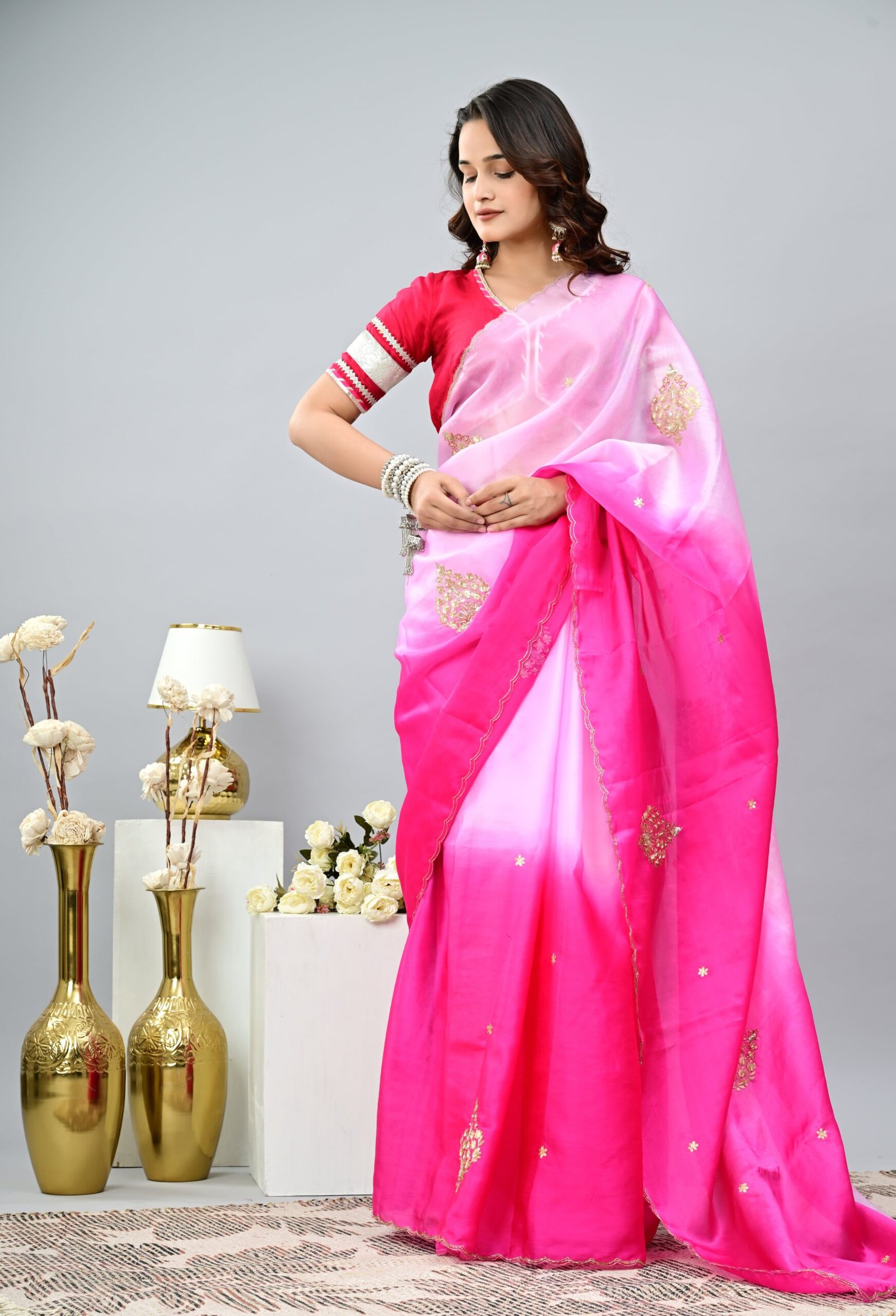 Step into elegance with our Pink Ombre Saree crafted in dreamy organza, highlighted with delicate handwork and paired with a rich opada silk blouse — perfect for weddings, festive occasions, and graceful evening looks.